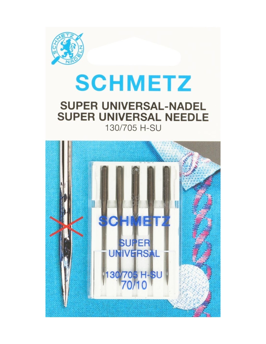 La couture à la machine de supports autocollants génèrent des résidus de colle qui s'attachent à l'aiguille et conduit souvent à des points défaits ou la rupture du fil. L'aiguille super universal a été conçue spécifiquement pour ces utilisations grâce à un enrobage lubrifiant et anti-adhésif.