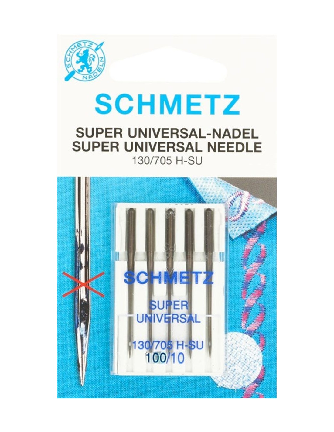 La couture à la machine de supports autocollants génèrent des résidus de colle qui s'attachent à l'aiguille et conduit souvent à des points défaits ou la rupture du fil. L'aiguille super universal a été conçue spécifiquement pour ces utilisations grâce à un enrobage lubrifiant et anti-adhésif.