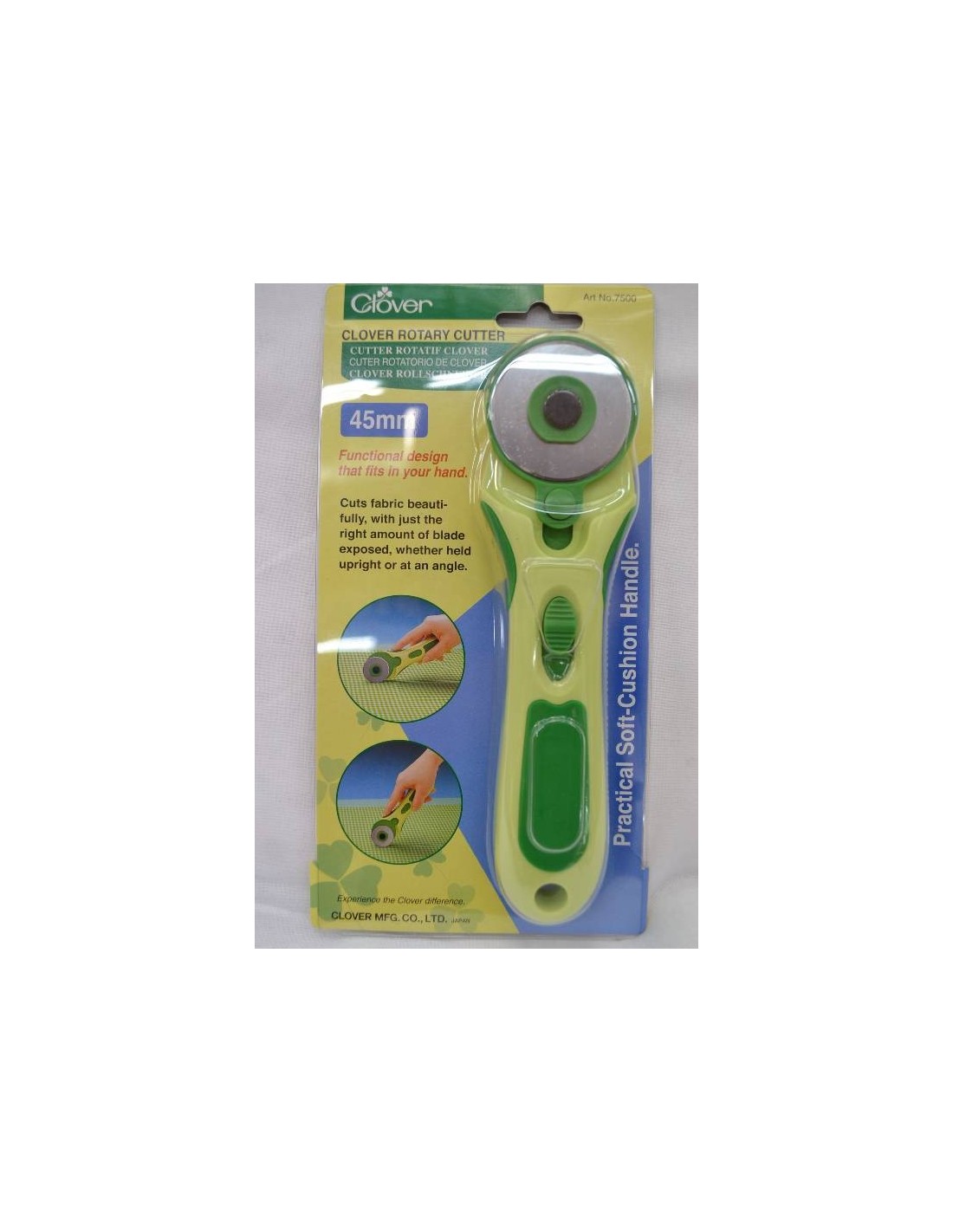 Cutter rotatif Clover, droitier ou gaucher, bonne prise en main, protection de la lame par bouton poussoir