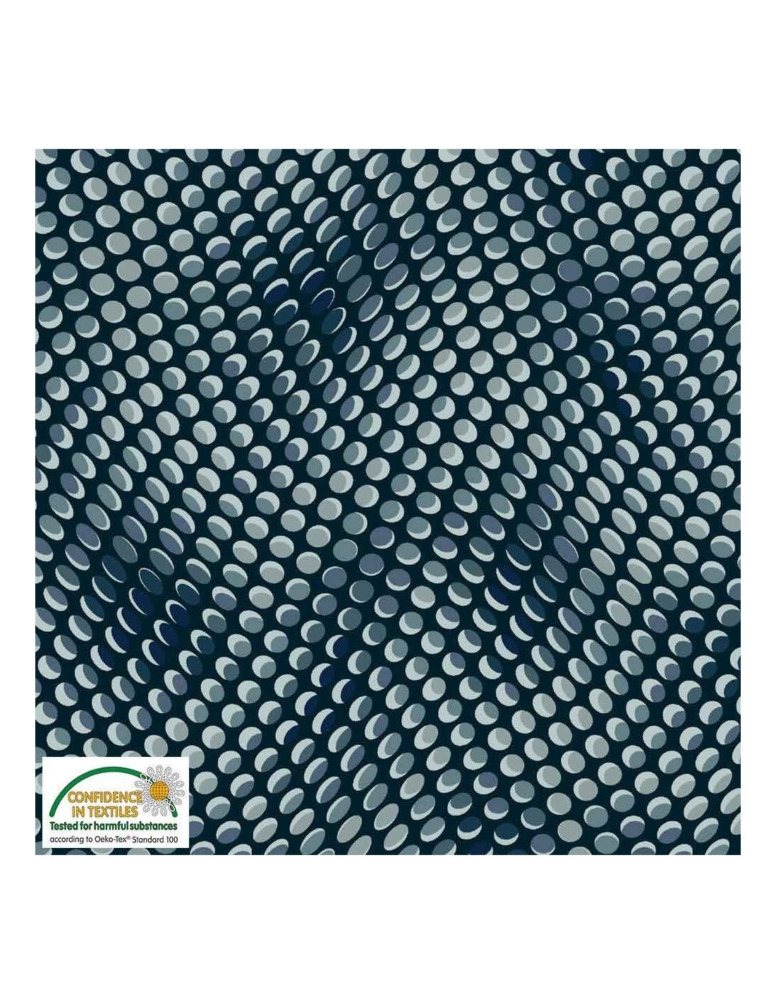 Tissu patchwork à pois avec effet d'optique, dans les tons de bleu-gris, bleu, blanc sur fond noir, idéal pour vos ouvrages de patchwork ou autres travaux de couture