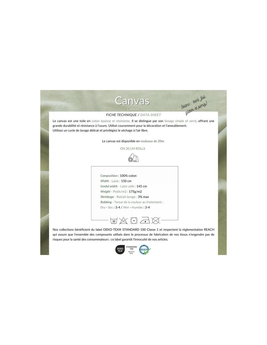 Tissu 100% coton,le canvas est une toile en coton epaisse et resistante en 1m50 de large.