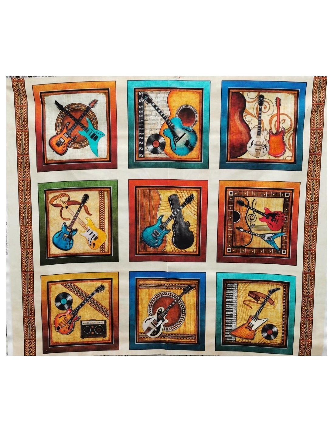 Panneau sur le thème de la musique avec des guitares, des disques, etc...