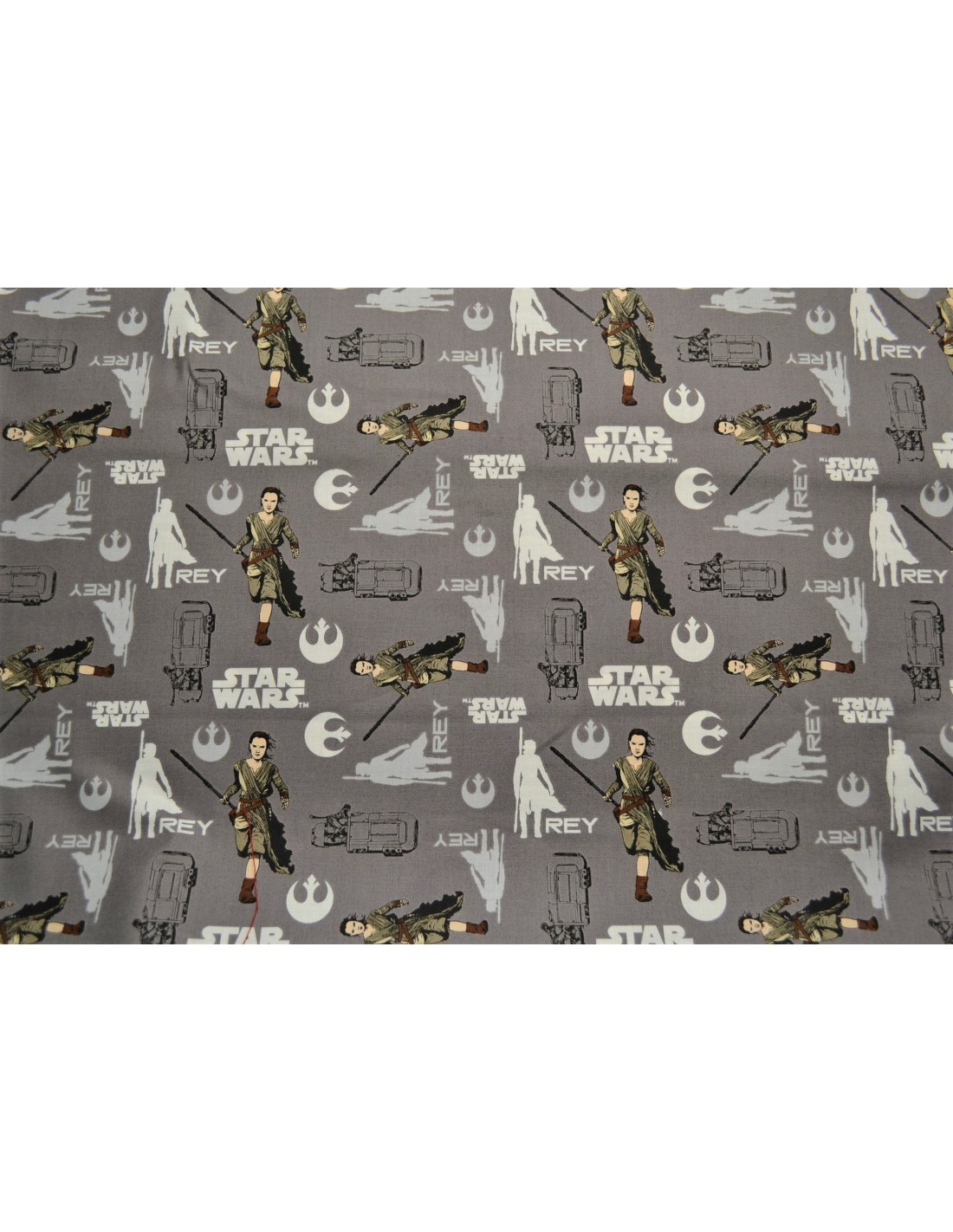 Tissu Star Wars avec l'héroïne de la dernière trilogie, Rey Skywalker, sur fond gris, idéal pour la confection de sac, pochette, trousse, coussin, etc...
