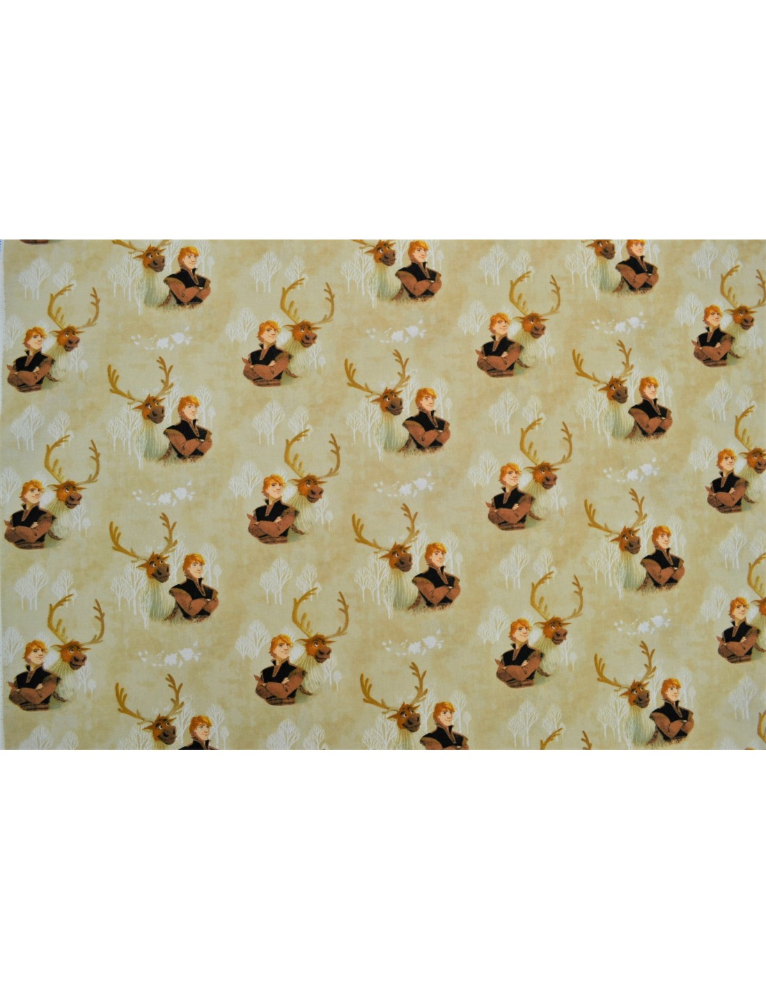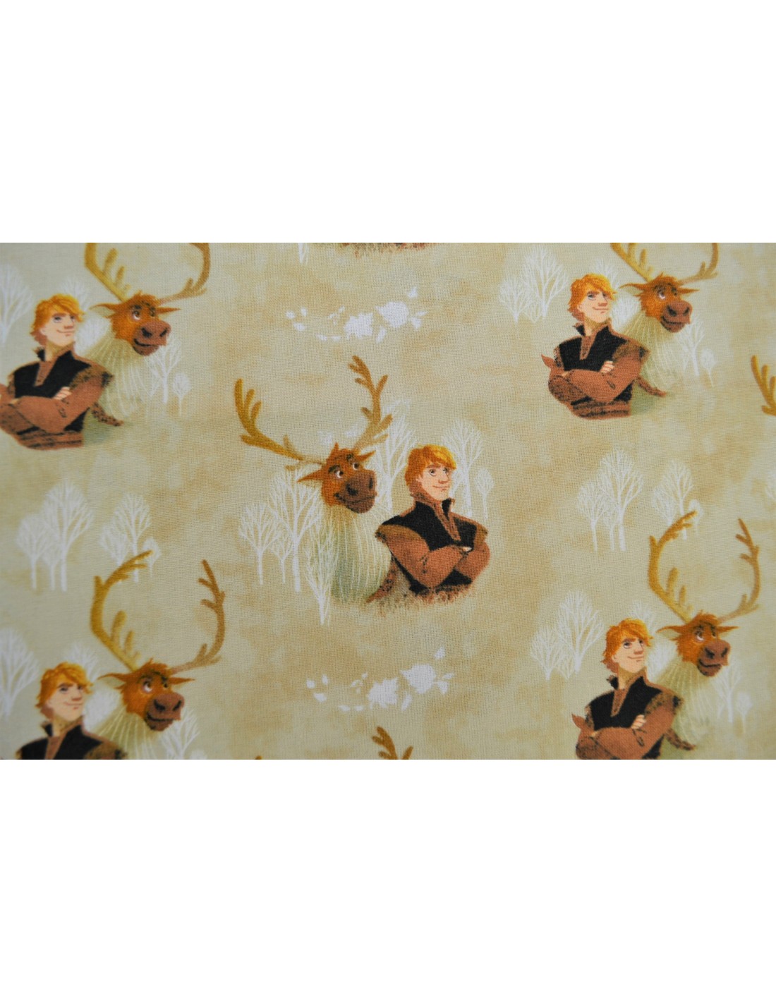 Tissu La Reine des neiges avec Kristoff et Sven sur un fond dans les tons de beige/marron, idéal pour la confection de coussins, sacs, trousses, pochettes, etc...