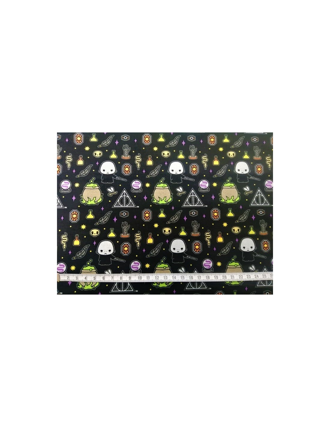 Tissu Harry Potter avec Voldemort style emoji fond noir, idéal pour la confection de masques, sacs, pochettes, coussins, cartonnage, patchwork, etc...